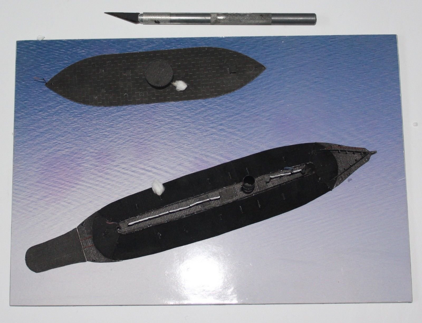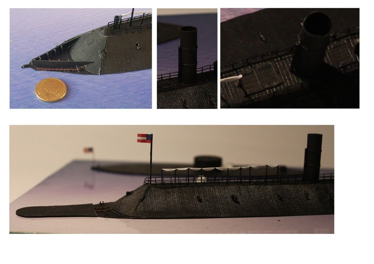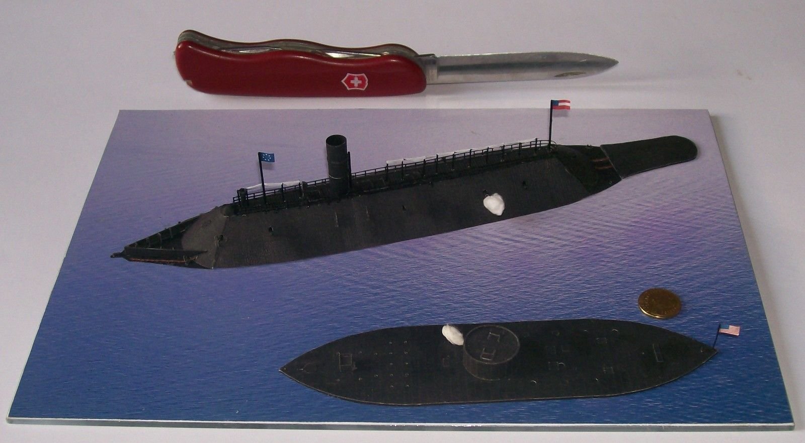 Natychmiast po otrzymaniu zapłaty przesyłam mailem pliki PDF zawierające plany wycinanki, imitację wody, instrukcję montażu oraz małą książeczkę o okrętach USS Monitor i CSS Virginia (8 stron). Model należy wydrukować na gładkim brystolu zaś imitację wody na papierze fotograficznym. Imitację blach pancernych robi się przed sklejeniem modelu za pomocą linijki oraz igły krawieckiej. Po sklejeniu model przewyższa dokładnością oraz jakością odwzorowania elementów zarówno modele plastikowe jak i żywiczne.